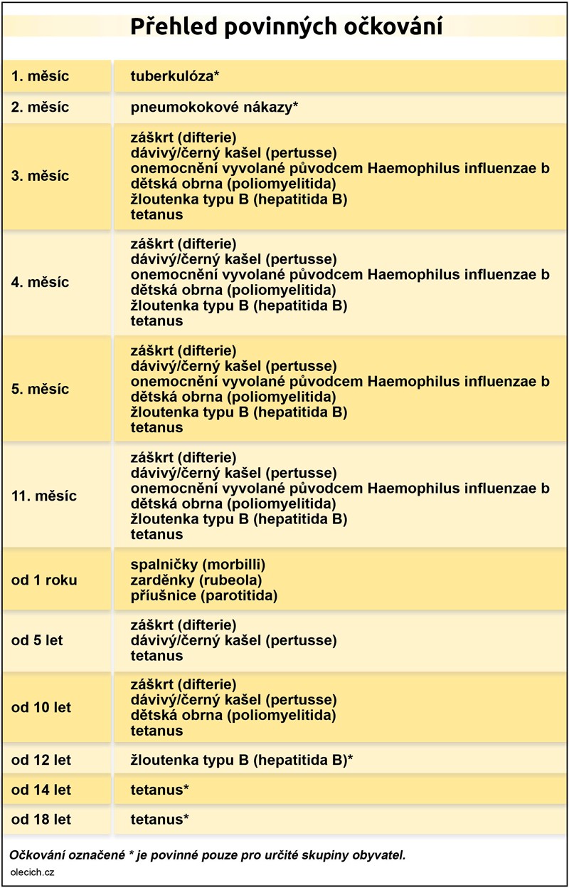 Mezi pravidelná očkování dětí podle vyhlášky o očkování proti infekčním nemocem patří očkování proti záškrtu tetanu dávivému kašli invazivnímu onemocnění vyvolanému původcem Haemophilus influenzae b přenosné dětské obrně a virové hepatitidě B proti spalničkám zarděnkám a příušnicím a u rizikových dětí proti tuberkulóze. Nezůstává důkaz o jejich provedení a jsou spolehlivé pouze u osob s příznaky. Povinné očkování proti koronaviru.